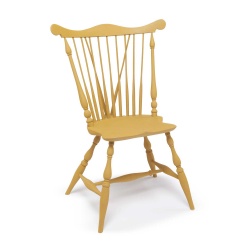 The fan-back side chair was introduced in North Eastern U.S. around 1760. The back spindles are carved and mortised directly into the seat and topped with a curved crest rail (featuring either turned up or turned down ears). Also typical of this style of chair ours has nine spindles (not including the brace if present).