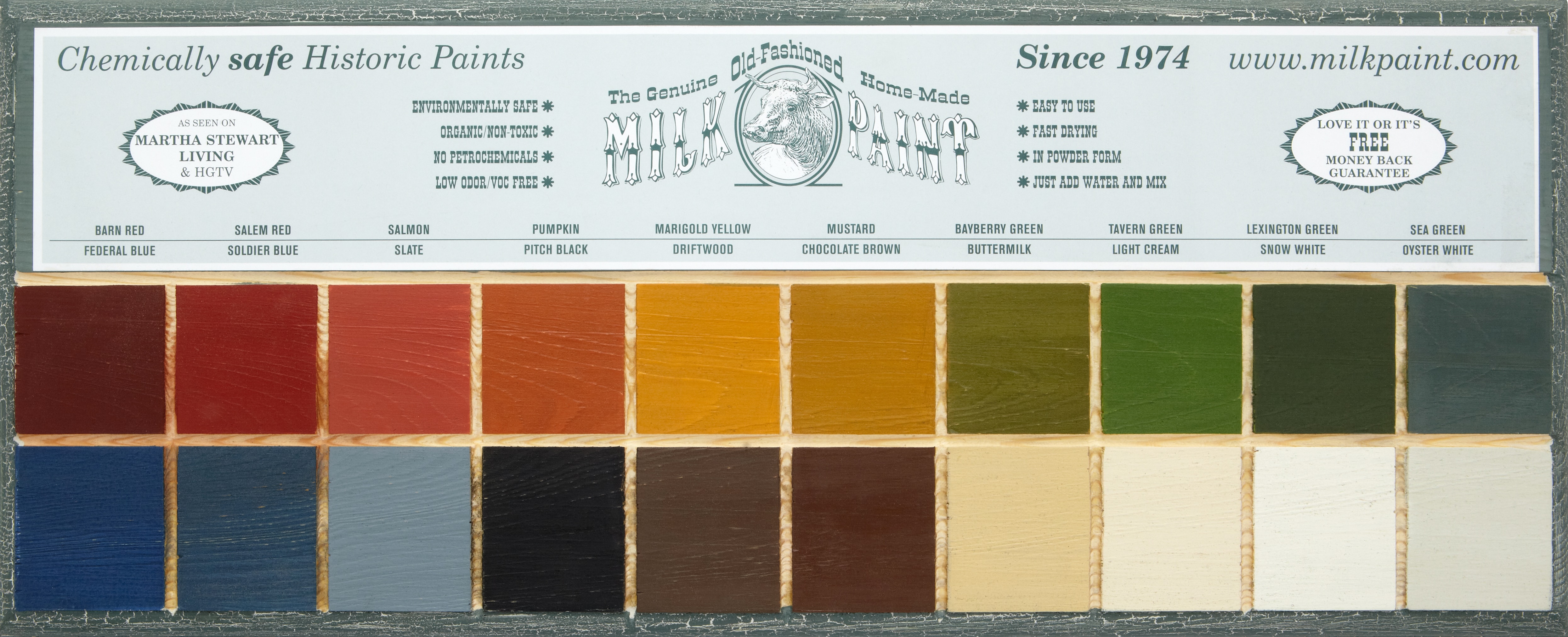 Finally, everything is wedged, hand sanded, and finished. Choose your finish milk paint color from the sample board. Click on the image for a close up. Due to the many variations in monitors and browsers, color samples may appear different on different monitors and screens.