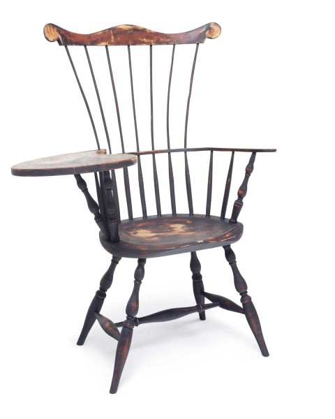 The Windsor Writing Arm Chair is based off from a traditional Comb-back Windsor design. The comb-back is considered the first "American-made" Windsors. These popular and comfortable chairs featured an oval seat, with arms typically made up of a single, steam-bent piece of wood, and legs with a simple taper in the foot.
